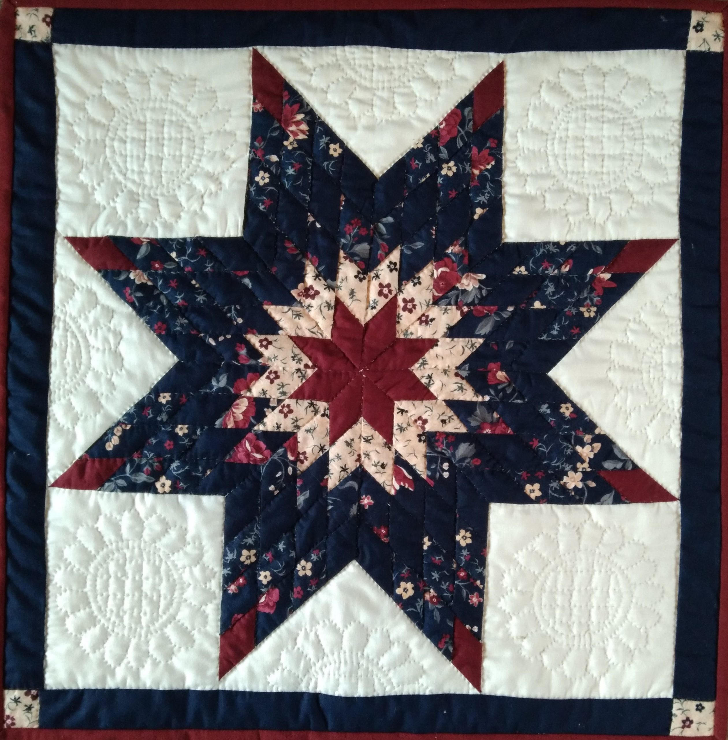 Loved as much today as years ago, the Lone Star is a favorite of quiltmakers. Exploding with color, the star radiates from its center to eight sharp points. The surrounding background is the perfect canvas to display fancy quilting stitches. Finished size is 22" x 22". Kit includes all 100% cotton fabrics needed to complete entire quilt (including quilt top, back, and binding), batting, quilting designs, and step-by-step illustrated instructions. Colors are burgundy, navy, white with floral accents.