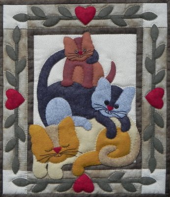 Purrfectly adorable, this cat stack will steal your heart. From lazy to playful, cats in three colors snuggle together in happy harmony. A border of hearts and leaves surrounds the contented trio. Finished size is 13” x 15”. Kit includes all woolfelt® for applique, all fabrics (100% cotton) for background, borders, back, and binding, batting, buttons for eyes, embroidery floss, precise patterns and complete illustrated instructions. Colors are gold, gray, rust, red, green, tan, mocha, and cream. Cat Stack Wall Quilt Kit