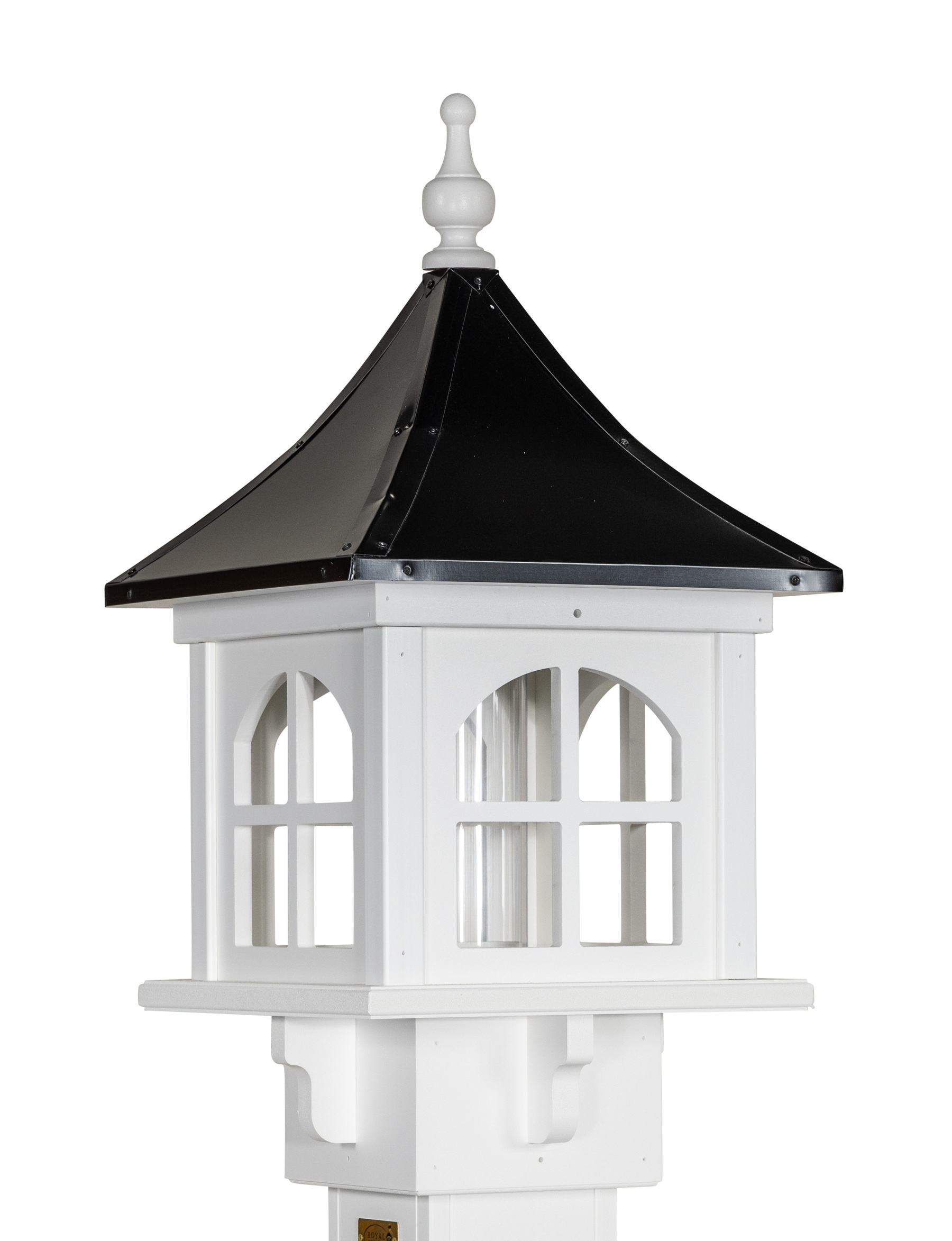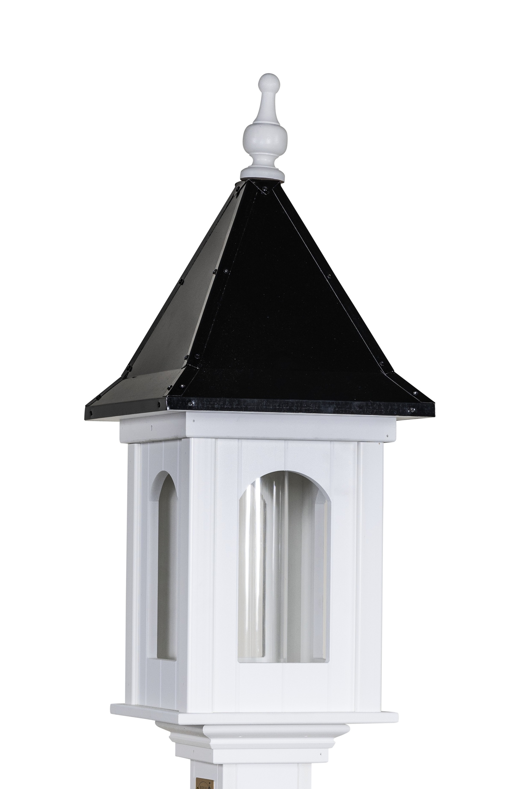 The Bethany patina copper roof bird feeder is made of cellular-pvc which is a maintenance-free product. It has a unique cupola design built to last a lifetime! It will not splinter, crack, or fade and needs no painting. The copper roof has been enhanced by a special process to give it an antique patina. The bird feeder comes with a mounting bracket for your 4 x 4 wooden post. Two thumb screws loosen easily to remove the roof for filling seed.  24 inches H x 13 inches square.