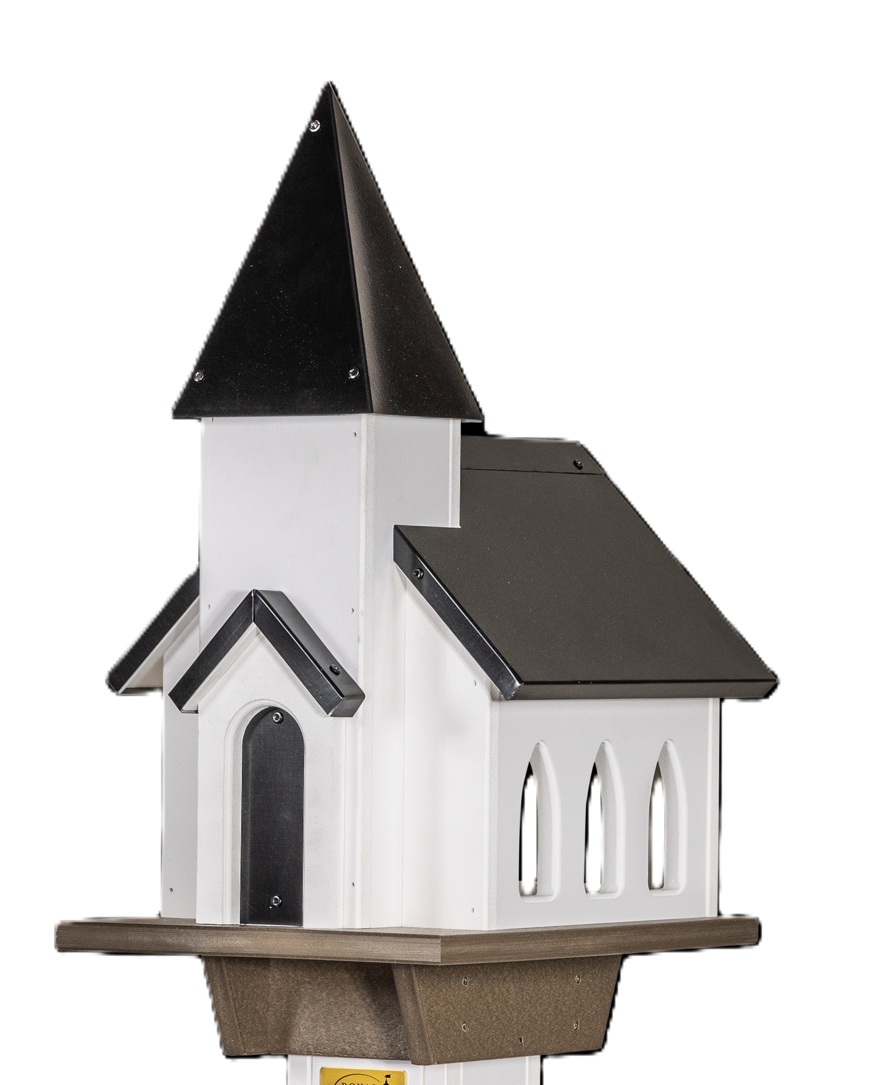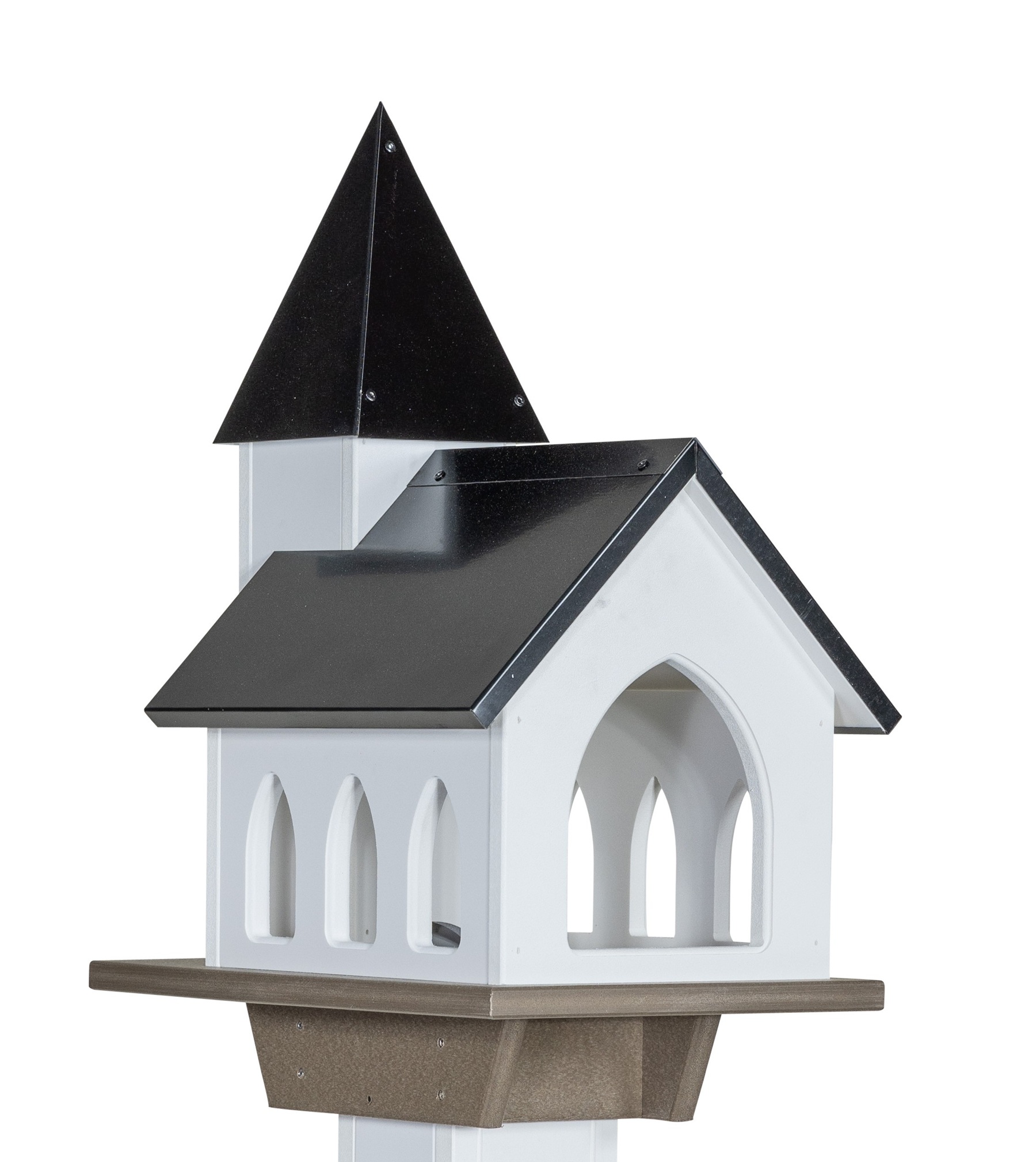 The Chapel copper roof bird feeder is made of cellular-pvc which is a maintenance-free product. It has a chapel design built to last a lifetime! It will not splinter, crack, or fade and needs no painting. The bird feeder comes with a mounting bracket for your 4 x 4 wooden post. Two thumb screws loosen easily to remove the roof for filling seed.