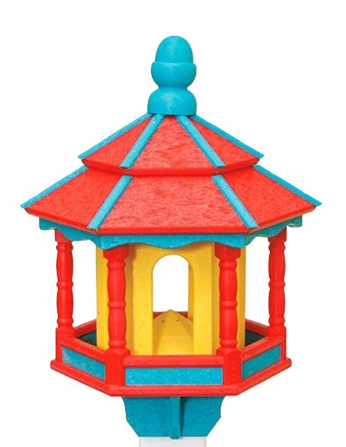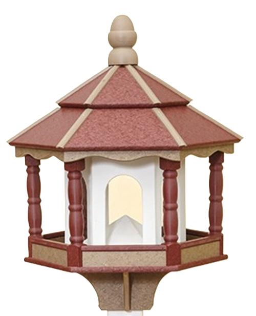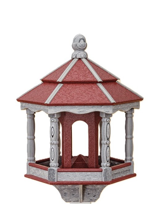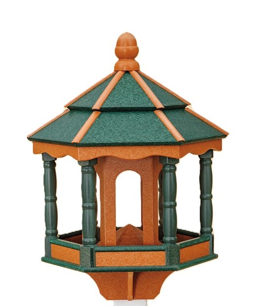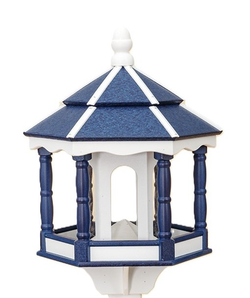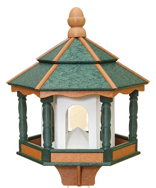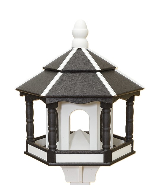 The Gazebo Bird Feeder is constructed with treated lumber. The roof is vinyl and will withstand time and weather. The wood is painted with an exterior grade white paint. Mounting bracket included so it's ready for your wooden 4" x 4" post. To fill with birdseed simply remove the finial and pour in your seed.